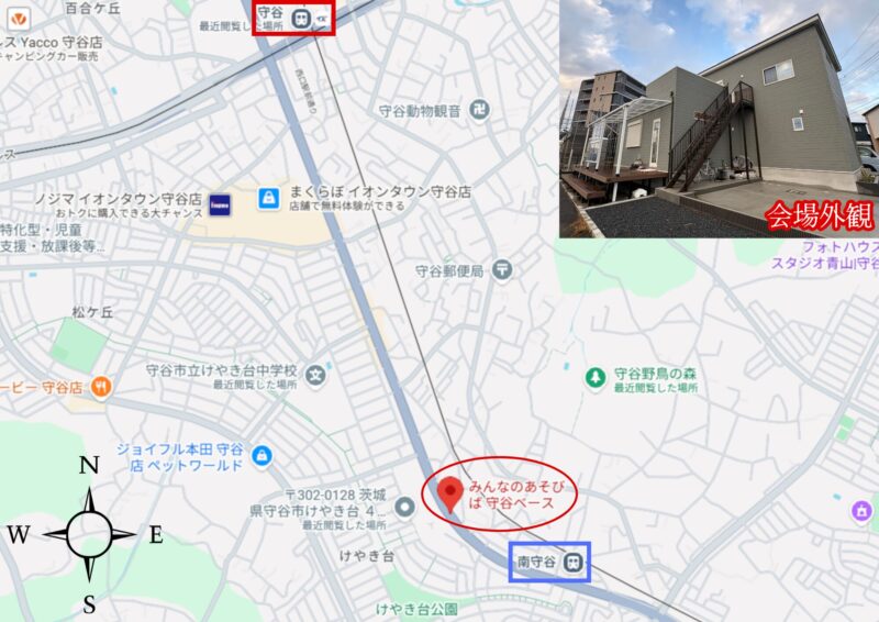 初めてお越しの方には「南守谷駅」からの徒歩ルートがおすすめです。